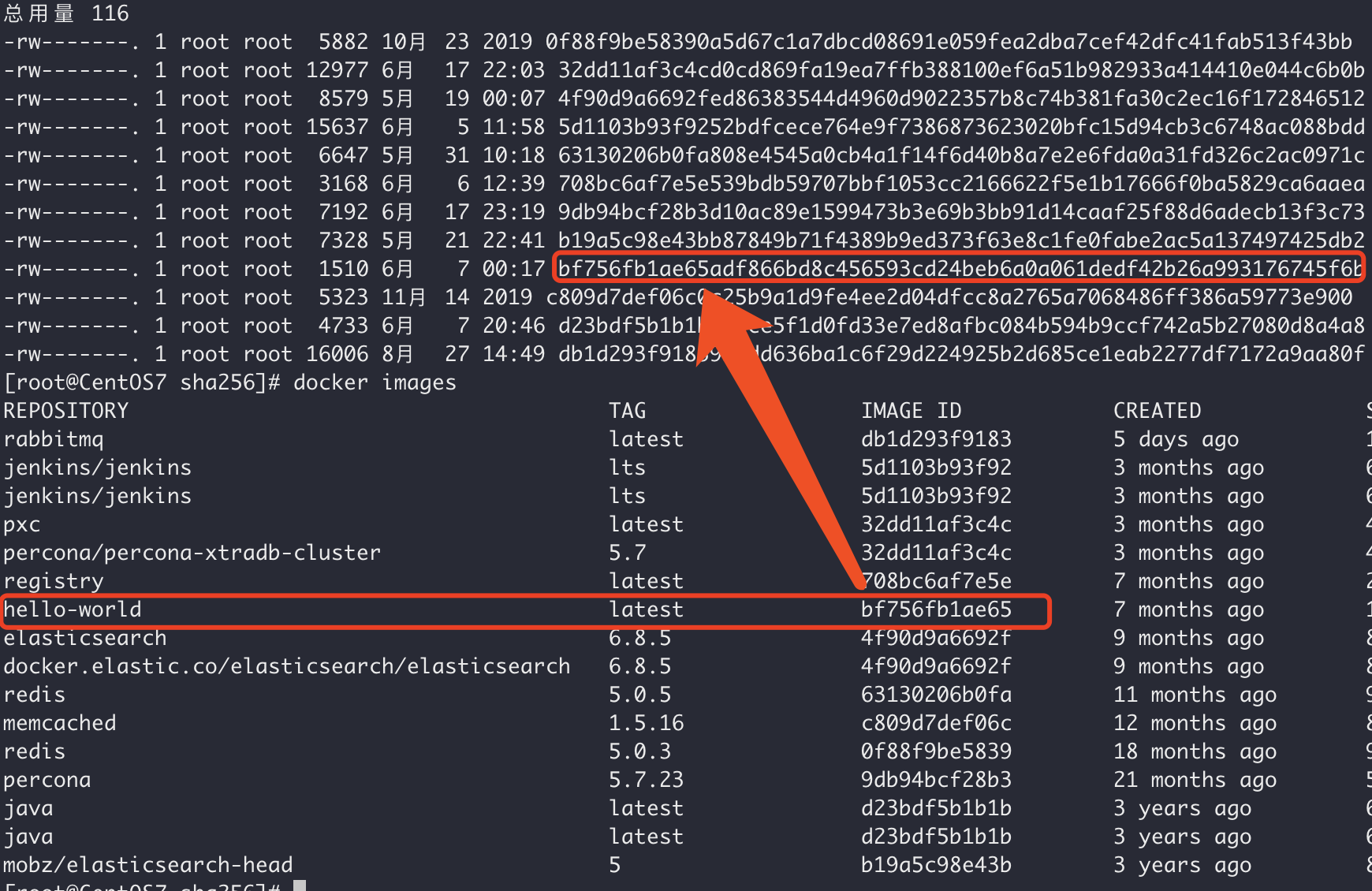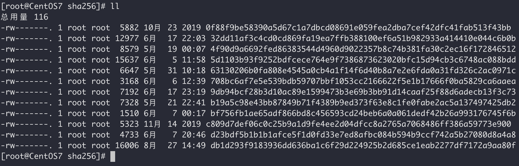 该目录即为 docker 中的所有镜像文件(以shar256加密方式加密后的镜像文件),我们通过 ll 查看一下: