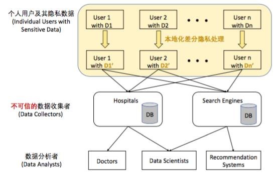 图 2: 本地化差分隐私的处理流程框架。区别于中心化差分隐私需要可信的 数据收集者,本地化差分隐私不需要可信的数据收集者。