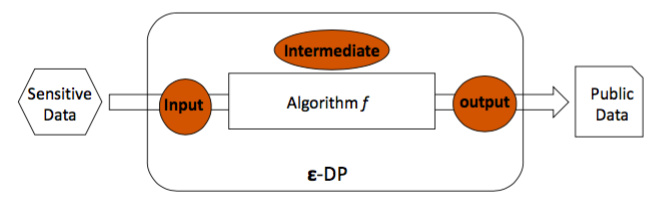 概况来讲,差分隐私的主要方法就是扰动(perturbation)和采样(sampling)。对于扰动方案,就是对输入数据 (input),中间数据 (intermediate)或者输出数据 (output) 进行扰动,加入噪音(见图3),使其满足 ε-差分隐私。对于输入数据扰动的典型方案就是随机响应(Randomized Response), 对于输出数据扰动的典型方案就是拉普拉斯算法(Laplace algorithm)。中间数据可以看做前面一个子阶段的输出,也可以看做是后面子阶段的输入,因此可以灵活选择输入或者输出扰动的算法。