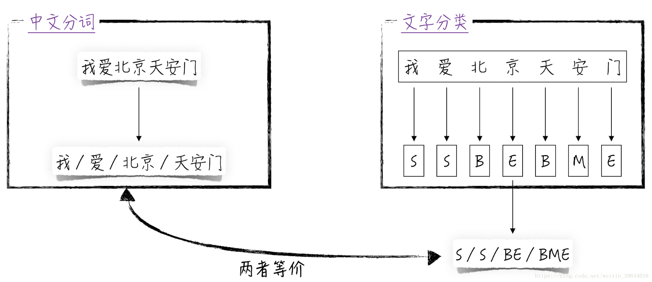 为了能到达上面的分词效果,我们首先需要将其转换为模型能处理的分类问题。具体地,假设文字一共有4种状态,分别以字母B、M、E、S表示。