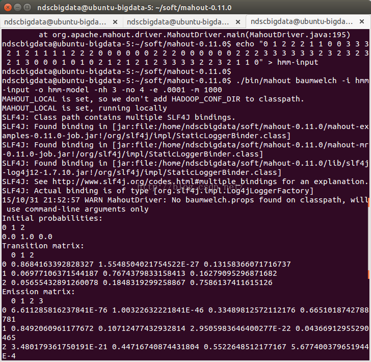 $ export MAHOUT_LOCAL=true $ $MAHOUT_HOME/bin/mahout baumwelch -i hmm-input -o hmm-model -nh 3 -no 4 -e .0001 -m 1000