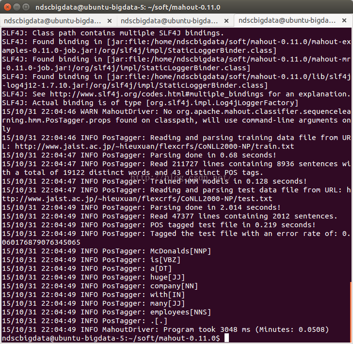 (2)进行mahout例子中的词性判断例子验证,其结果如图所示: