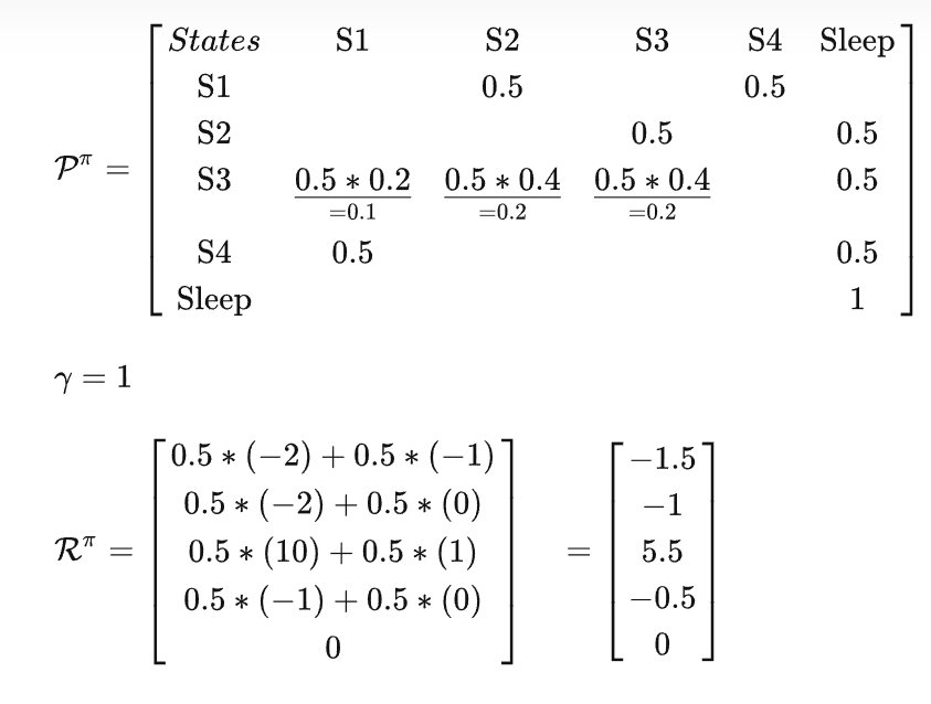 v(s)=mathbb{E}[R_{t+1}+gamma v(S_{t+1})vert S_t=s]=R_s+gamma sum_{s^{prime}in mathcal{S}}mathcal{P}_{SS^{prime}}v(s^{prime})