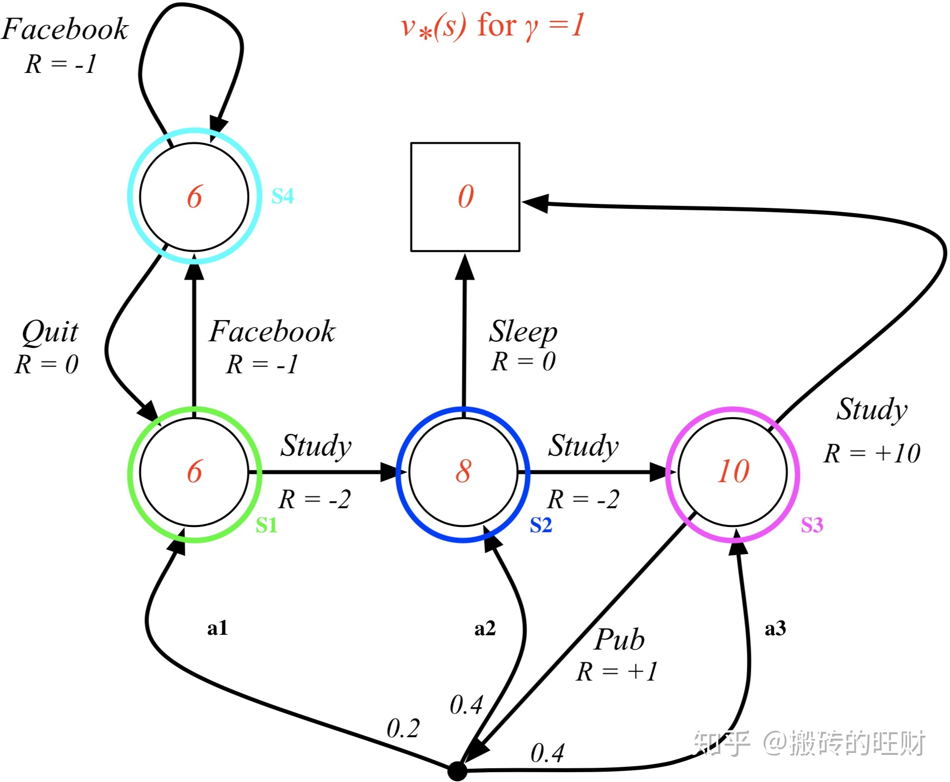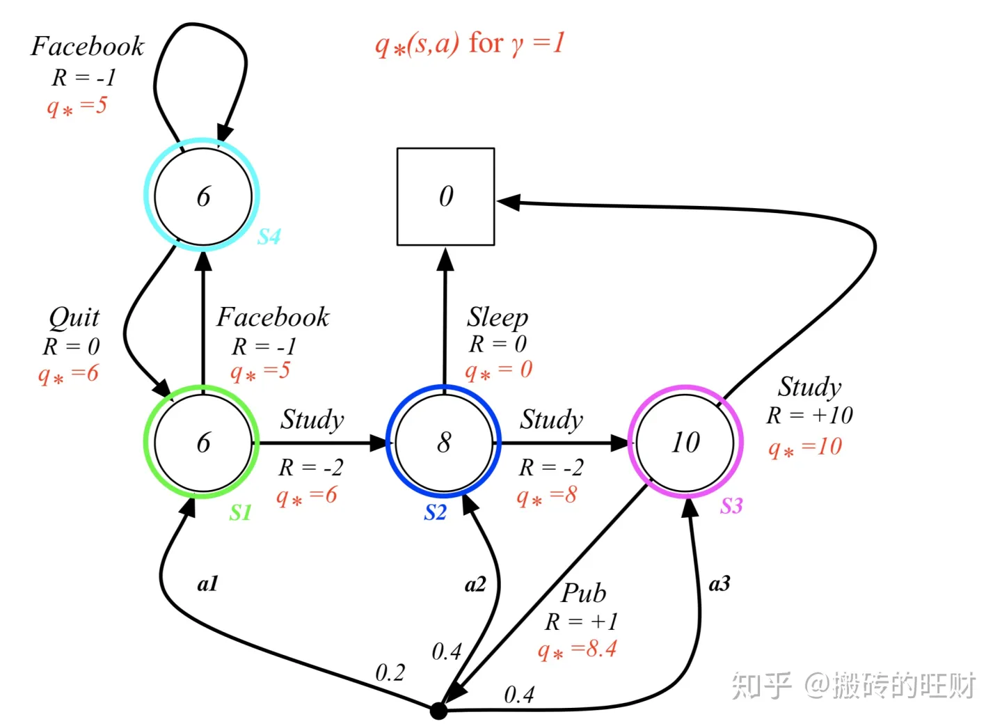 q∗(S3,Pub)=RS3Pub+γPS3⋅Puba′maxq∗(⋅,a′)=RS3Pub+γ(P⋅S1a1max(q∗(S1,Facebook),q∗(S1,Study))+P⋅S2a2max(q∗(S2,Sleep),q∗(S2,Study))+P⋅S3a3max(q∗(S3,Pub),q∗(S3,Study)))=1+0.2×max((q∗(S1,Study),q∗(S1,Facebook))+0.4×max((q∗(S2,Sleep),q∗(S2,Study))+0.4×max((q∗(S3,Pub),q∗(S3,Study))