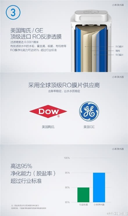 ③美国陶氏/GE顶级进口RO反渗透膜,除水垢重金属细菌等,净化能力高达95%;