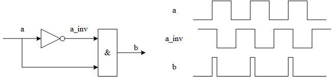 一个比较典型的竞争冒险电路如下,我尝试参考这种方式去生成0ps的毛刺。