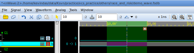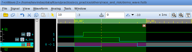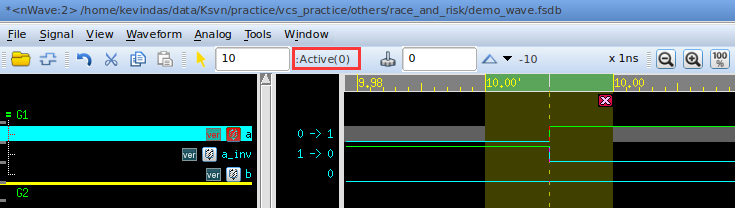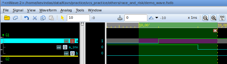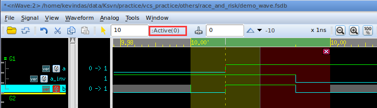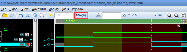 可以看到,a的取值在Active区域发生变化后,会先让b的取值变为1;a_inv的取值在NBA区域发生变化后,会让b的取值变为0。二者的效果叠加,最终在b上输出的就是一个0ps的脉冲。