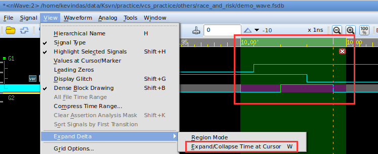 首先鼠标左键选择需要展开的时间点,然后按下图所示的选项展开这个时间点,可以看到在这个时间点上,信号变化的先后顺序。
