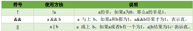 逻辑运算符是连接多个关系表达式用的,可实现更加复杂的判断,一般不单独使用,都需要配合具体 语句来实现完整的意思,如下表所示: