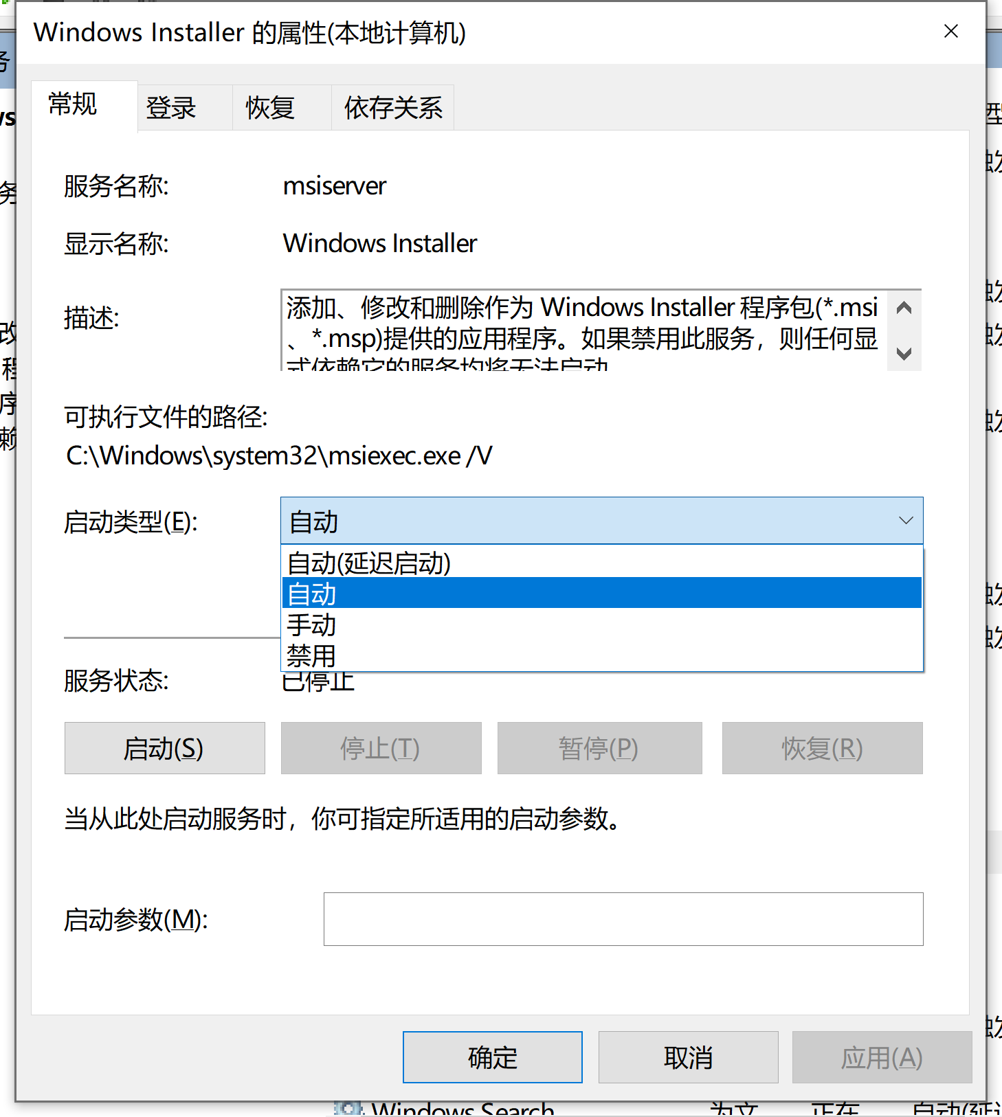 7、在页面上将启动类型设置为“自动”,并“启动”该服务,点击确定关闭窗口,即可解决问题。