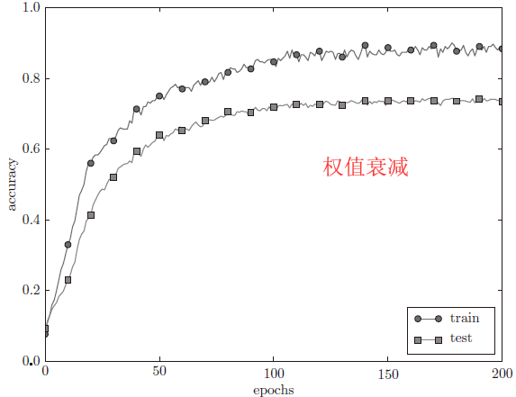 权值衰减也是一种防止过拟合的方法,通过为损失函数加上权重的L1、L2、L ∞ infty ∞范数,对学习过程中打的权重进行惩罚。其中L2范数最为常用,它会引入一个控制惩罚程度的超参数 λ lambda λ。