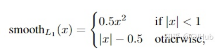 即平滑的L1损失(SLL),出自Fast RCNN [7]。SLL通过综合L1和L2损失的优点,在0点处附近采用了L2损失中的平方函数,解决了L1损失在0点处梯度不可导的问题,使其更加平滑易于收敛。此外,在|x|>1的区间上,它又采用了L1损失中的线性函数,使得梯度能够快速下降。