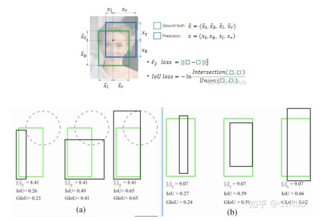 即交并比损失,出自UnitBox [8],由旷视科技于ACM2016首次提出。常规的Lx损失中,都是基于目标边界中的4个坐标点信息之间分别进行回归损失计算的。因此,这些边框信息之间是相互独立的。然而,直观上来看,这些边框信息之间必然是存在某种相关性的。如下图(a)-(b)分别所示,绿色框代表Ground Truth,黑色框代表Prediction,可以看出,同一个Lx分数,预测框与真实框之间的拟合/重叠程度并不相同,显然重叠度越高的预测框是越合理的。IoU损失将候选框的四个边界信息作为一个整体进行回归,从而实现准确、高效的定位,具有很好的尺度不变性。为了解决IoU度量不可导的现象,引入了负Ln范数来间接计算IoU损失。