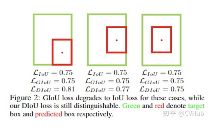 即距离IoU损失,全称为Distance-IoU loss,由天津大学数学学院研究人员于AAAI2020所发表的这篇论文 (https://arxiv.org/abs/1911.08287)中首次提出。上面我们谈到GIoU通过引入最小闭合凸面来解决IoU无法对不重叠边框的优化问题。但是,其仍然存在两大局限性:边框回归还不够精确 & 收敛速度缓慢 。考虑下图这种情况,当目标框完全包含预测框时,此时GIoU退化为IoU。显然,我们希望的预测是最右边这种情况。因此,作者通过计算两个边框之间的中心点归一化距离,从而更好的优化这种情况。