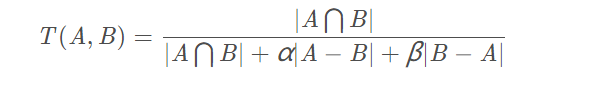Tversky loss,发表于CVPR 2018上的一篇《Tversky loss function for image segmentation using 3D fully convolutional deep networks》文章 [5],是根据Tversky 等人于1997年发表的《Features of Similarity》文章 [6] 所提出的Tversky指数所改造的。Tversky系数主要用于描述两个特征(集合)之间的相似度,其定义如下: