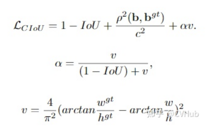 CIoU的计算公式如下所示,可以看出,其在DIoU的基础上加多了一个惩罚项αv。其中α为权重为正数的重叠面积平衡因子,在回归中被赋与更高的优先级,特别是在两个边框不重叠的情况下;而v则用于测量宽高比的一致性。