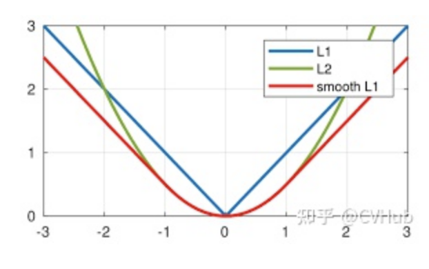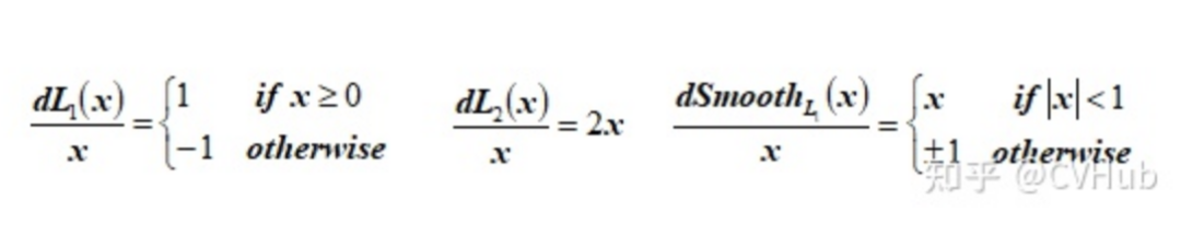 通过对这三个损失函数进行求导可以发现,L1损失的导数为常数,如果不及时调整学习率,那么当值过小时,会导致模型很难收敛到一个较高的精度,而是趋向于一个固定值附近波动。反过来,对于L2损失来说,由于在训练初期值较大时,其导数值也会相应较大,导致训练不稳定。最后,可以发现Smooth L1在训练初期输入数值较大时能够较为稳定在某一个数值,而在后期趋向于收敛时也能够加速梯度的回传,很好的解决了前面两者所存在的问题。
