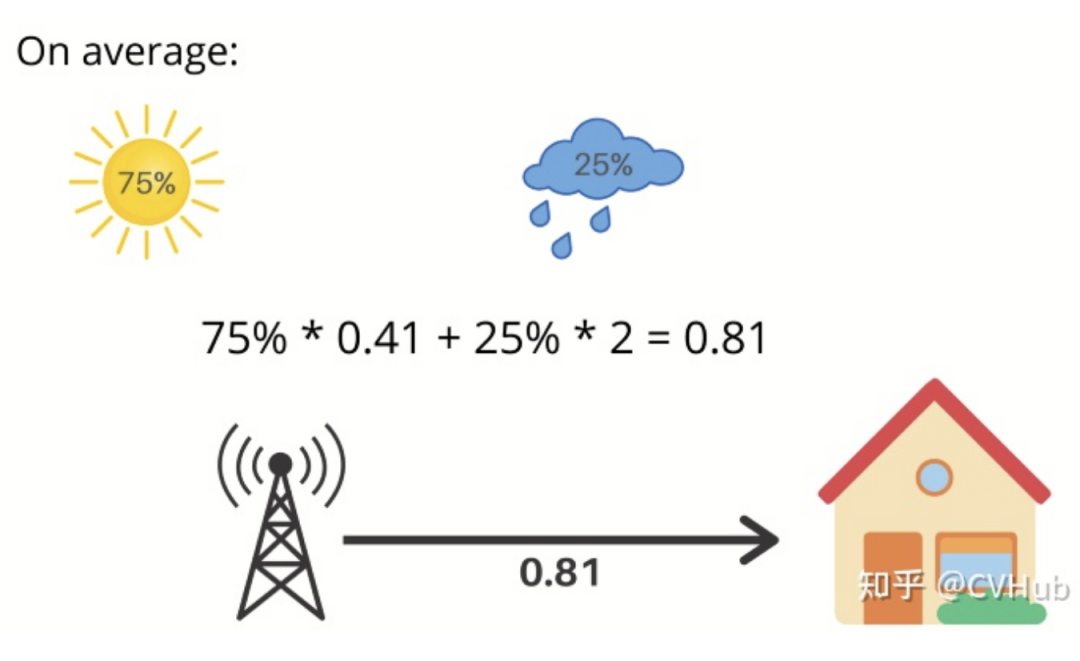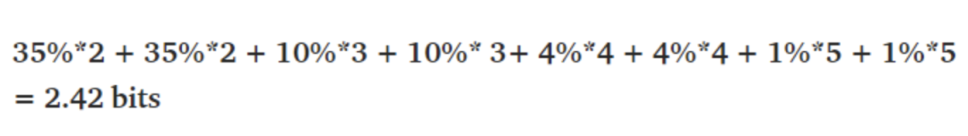现在,我们只使用2位用于表示晴天或部分晴天,使用3位用于多云和大部分多云,使用4位用于表示中雨和小雨,使用5位用于大雨和雷暴。天气的编码方式是明确的,并且如果你链接多条消息,则只有一种方法可以解释位的顺序。例如,01100只能表示部分晴天(01),然后是小雨(100)。因此,如果我们计算该站每天发送的平均比特数,则可以得出:
