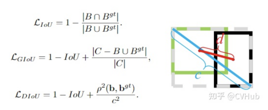 左图给出这三个IoU损失所对应的计算公式。对于DIoU来说,如图右所示,其惩罚项由两部分构成:分子为目标框和预测框中心点之间的欧式距离;分母为两个框最小外接矩形框的两个对角线距离。因此, 直接优化两个点之间的距离会使得模型收敛得更快,同时又能够在两个边框不重叠的情况下给出一个优化的方向。