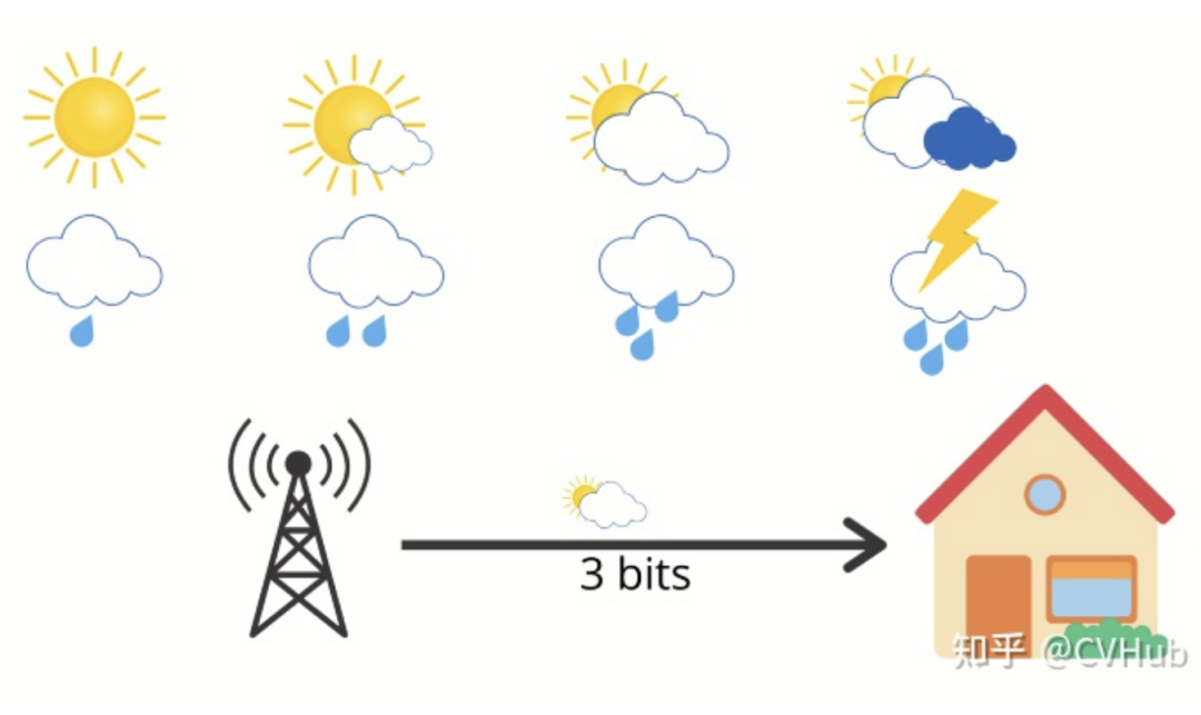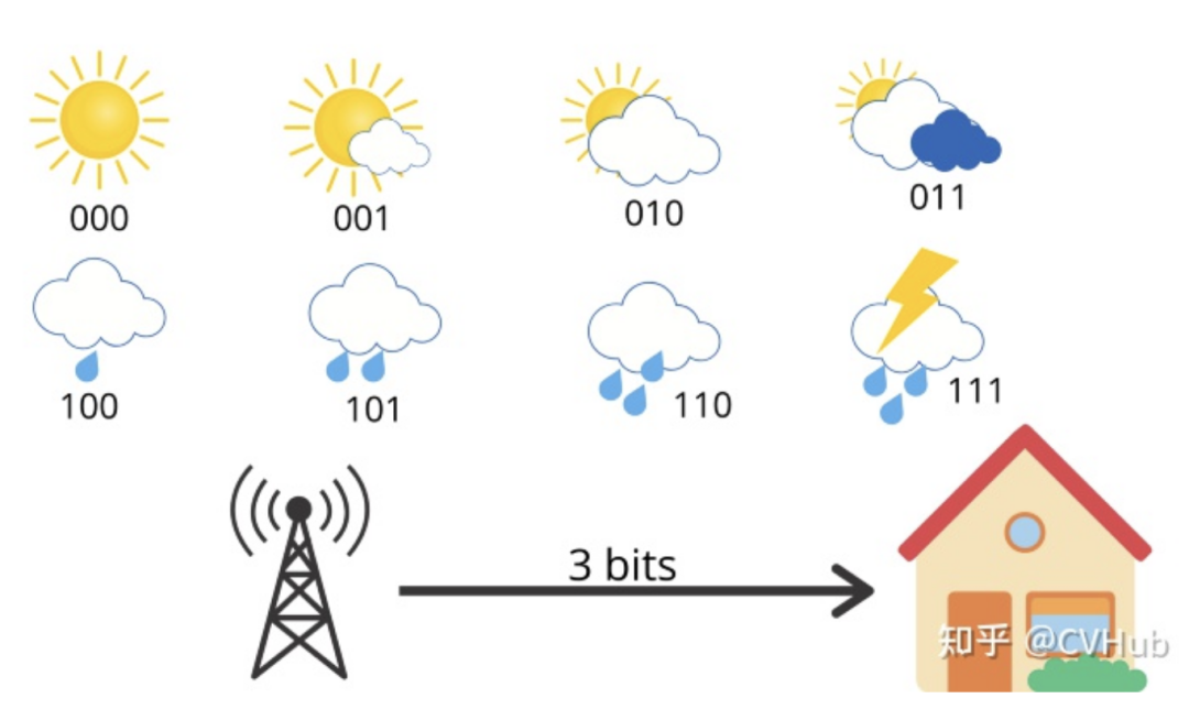 现在,如果气象站告诉您明天将要下雨,那么他们将不确定性降低了2倍。起初,有两种同样可能的可能性,但是在收到气象站的更新信息后,我们只有一种 。在这里,气象站向我们发送了一点有用的信息,无论他们如何编码这些信息,这都是事实。即使发送的消息是雨天的,每个字符占一个字节,消息的总大小为40位,但它们仍然只通信1位的有用信息。现在,我们假设天气有8种可能状态,且都是等可能的。