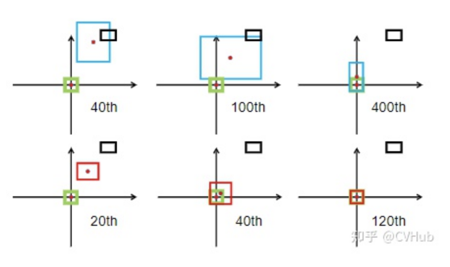 下图表示的是GIoU损失(第一行)和DIoU损失(第二行)的一个训练过程收敛情况。其中绿色框为目标边框,黑色框为锚框,蓝色框和红色框则分别表示使用GIoU损失和DIoU损失所得到的预测框。可以发现,GIoU损失一般会增加预测框的大小使其能和目标框重叠,而DIoU损失则直接使目标框和预测框之间的中心点归一化距离最小,即让预测框的中心快速的向目标中心收敛。