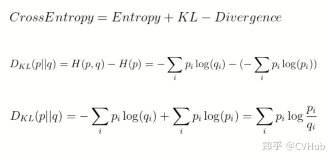 即KL散度。对于交叉熵损失,除了我们在这里使用预测概率的对数(log(q(i)))外,它看起来与上面熵的方程非常相似。如果我们的预测是完美的,那就是预测分布等于真实分布,此时交叉熵就等于熵。但是,如果分布不同,则交叉熵将比熵大一些位数。交叉熵超过熵的量称为相对熵,或更普遍地称为库尔贝克-莱布里埃发散度(KL Divergence)。总结如下: