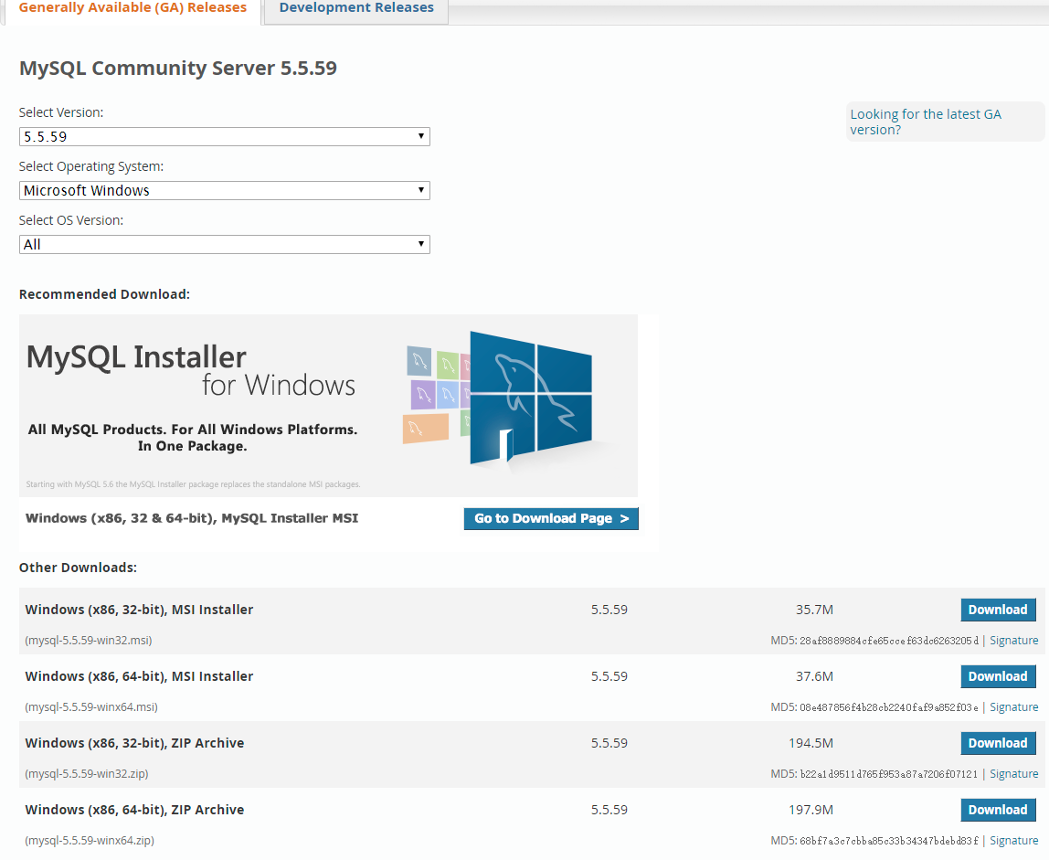 从下面的连接里下载到Mysql数据库,它的版本是mysql-5.5.59-winx64.msi,这个适合Windows 64位版本,如果是linux你自己下载相应的版本。