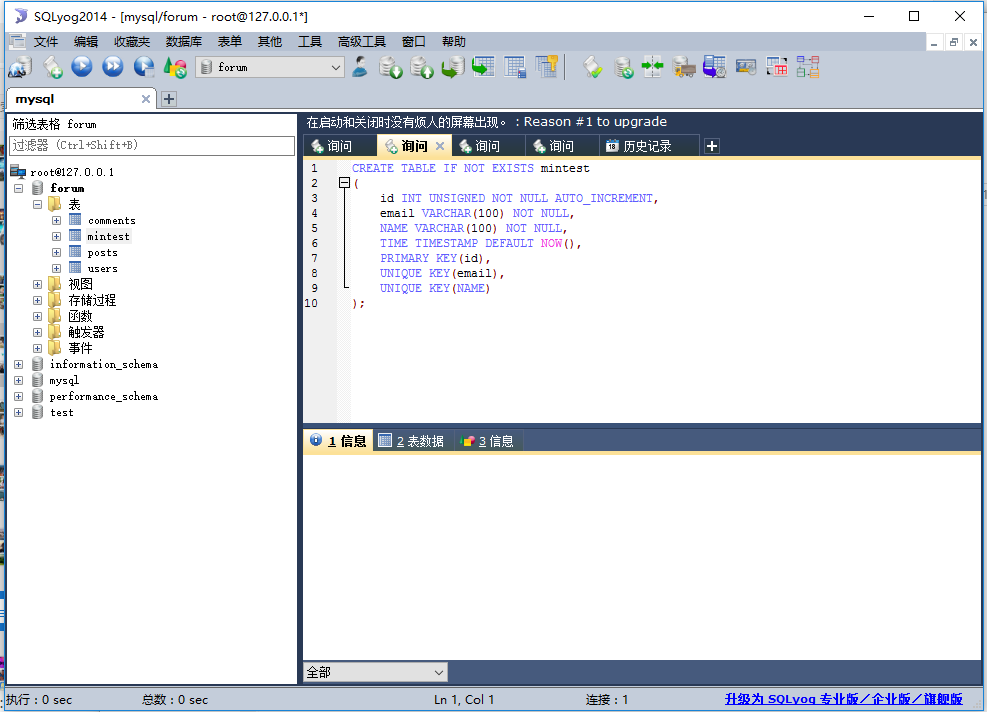 运行这段SQL语句之后,就会创建一个论坛的数据库,但是为了简单地测试,我在这个数据库添加了自己的测试表:
