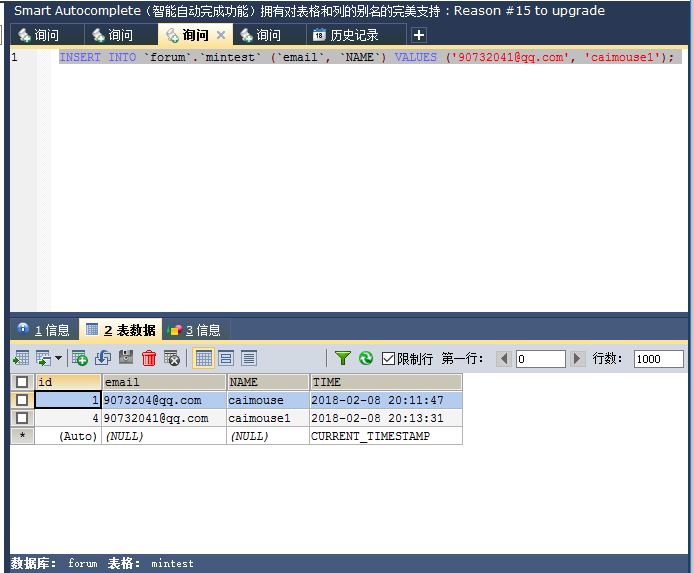 INSERT INTO `forum`.`mintest` (`email`, `NAME`) VALUES ('90732041@qq.com', 'caimouse1');