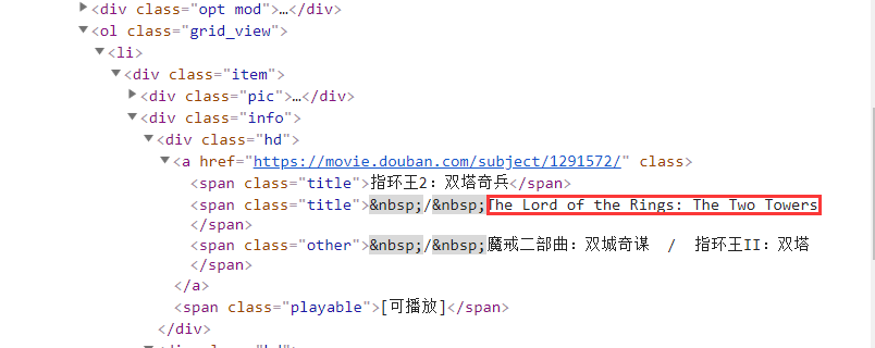 我们也许会通过“div”->class_='hd'->a->span的标签层级来获取框选内容,但是这样也会得到中文的titile,而我们使用