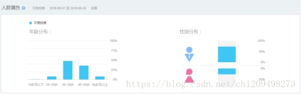 用户性别,目前来看男性占比远高于女性,达到73%,比起链家系的其他app比例要高,这可能是因为贝壳用户激增的契机是通过世界杯投放广告,观看世界杯的用户群体男性比例远高于女性的原因。