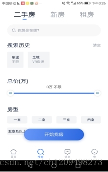 把搜索页面结合起来比起只有简单一个搜索框,需要点击下拉更换新房二手房类型的设计要出彩。但是直接把搜索放在一级页面似乎有点太浪费,更建议把搜索和发现房源等功能结合,或者放置地图找房功能,更多地曝光房源。