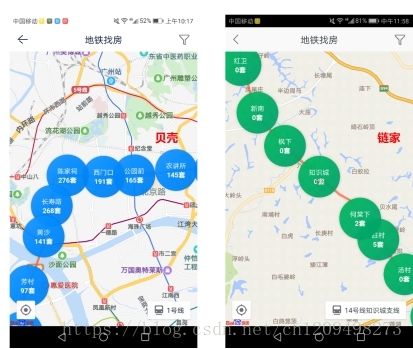 地铁找房,用户可以通过地铁线路或者地铁站点找房。但交互上稍有缺陷,点击小区之后会弹出房源列表的半屏内容,但是点击返回键,并不是半屏内容收起,而是退出地铁找房功能回到地图上。