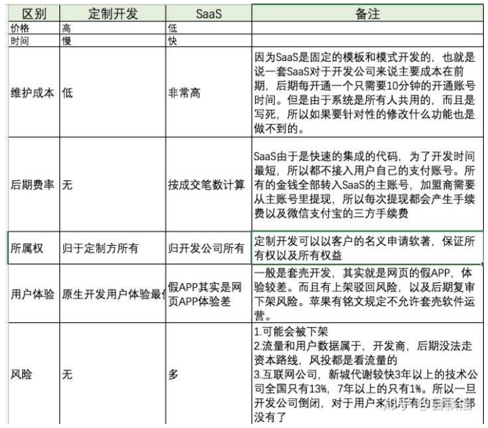 这里给大家提供一个新名词,随着行业的不断衍生和发展,技术公司也有了自己降低成本的方式,这个新产物叫“SaaS”这里我先不说SaaS不好,因为针对不同人群,SaaS确实也解决了很多人的问题。为了方便大家理解我专门做了个表,你说的那种几千的肯定是SaaS不用怀疑,定制是不可能那个成本把控出一个项目的。