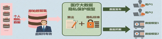 医疗数据集中通常包含着许多患者隐私信息,如医疗诊断结果、处方信息、检验检查报告等。一方面,如果数据持有者不采取适当隐私保护技术而直接将这些数据进行发布,会造成患者的隐私泄漏;另一方面,Netflix用户隐私泄漏等一系列案例表明去除标示符的操作无法保证医疗隐私信息的安全。如何从医疗数据集中提取有价值信息而又不泄露患者隐私是医学隐私保护的关键问题。针对这一问题,研究者们提出了各类算法保护患者的隐私信息,这些算法和他们的隐私标准被称为隐私保护模型,如图所示。