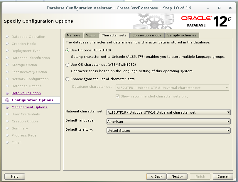 注:下载好的Oracle要放到/orcl/app/oracle目录下,/orcl/app/oracle/下是2个目录:product和database。解压后的安装文件放在database下。然后就会出现安装界面,配置过程从略。需要注意的是字符集要选择unicode。如下