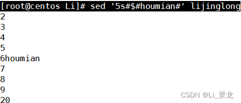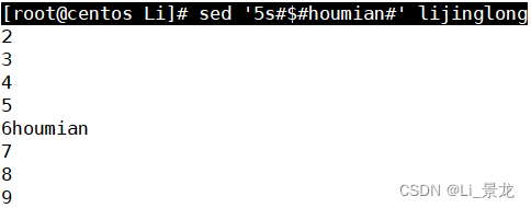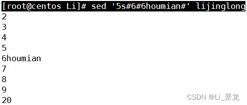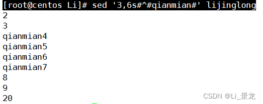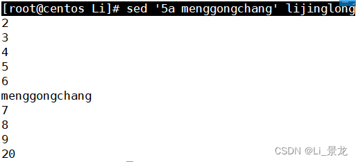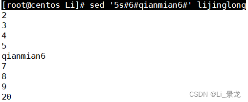 | 4.读取2-6行的内容 [root@centos Li]# sed -n '2,6p' lijinglong | ||||