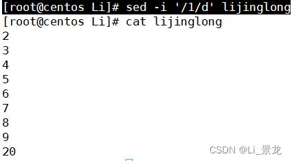 [root@centos Li]# sed -i '/1/d' lijinglong 阻止含有字符串1的行输出,-i对源文件产生作用,所以源文件中的字符串含有1的行会被清除。 | |||