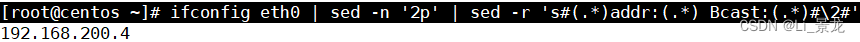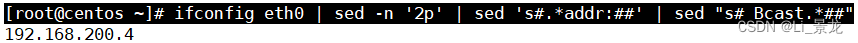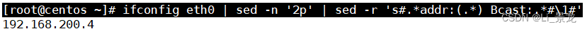 分析:ifconfig eth0:查看本机eth0IP地址;通过管道符,对前面的字符串进行过滤,显示第二行内容;再通过管道符引用扩展正则,排除.*addr:和 Bcast:,此时小括号内的东西正好是IP地址,所以使用/1提取小括号内的内容,就是IP地址。 (.*)为想要的数据,可以使用/n来进行提取,若只有一个小括号,那么就使用/1来提取,若有多个小括号,那么提取的内容如果是第n个小括号,那么就使用/n来进行提取括号内的数据。 如: