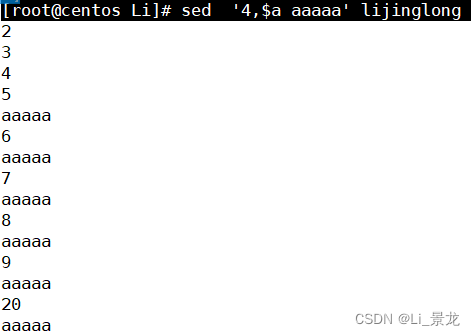 | 5.读取11行和末行 [root@centos Li]# sed -n '11p;$p' lijinglong 读取15-末行 [root@centos Li]# sed -n '15,$p' lijinglong | ||||