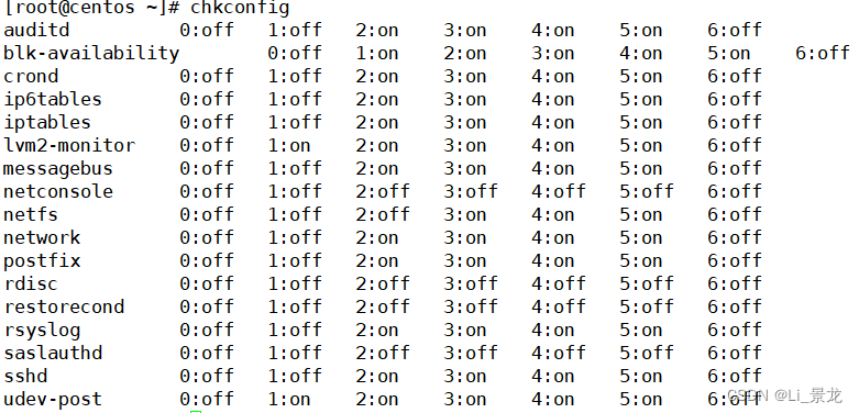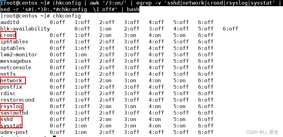 一般必须启动的服务:network(网络服务)、crond(定时任务)、sysstat(系统监控工具)、rsyslog(系统日志服务)、sshd(远程连接服务) 如果没有这些服务,那么使用yum进行安装。 | ||||