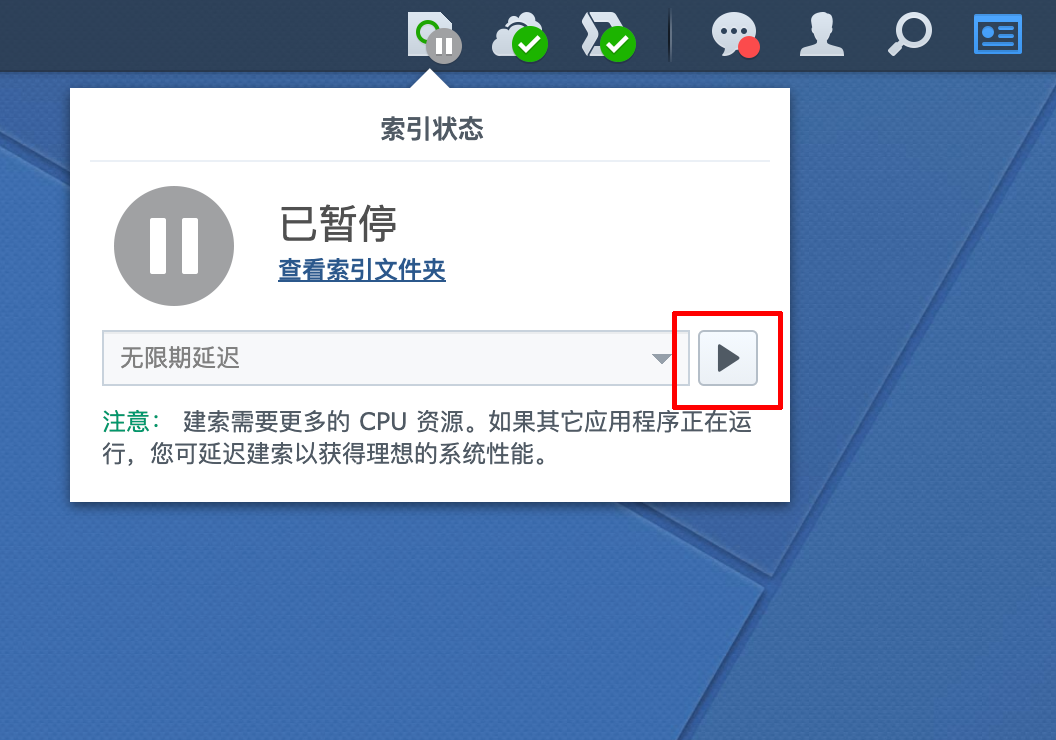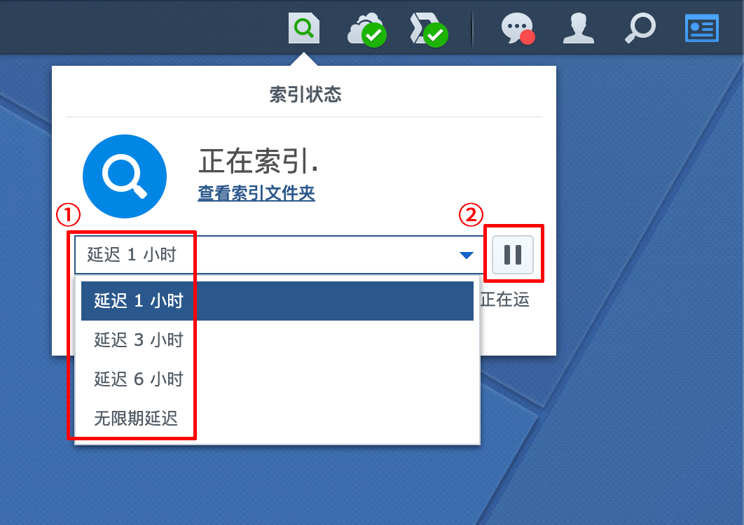 所以建议大家错峰进行索引,可以在需要使用 NAS 时,在 DSM 首页右上角选择需要延后的时间,并【暂停】索引任务
