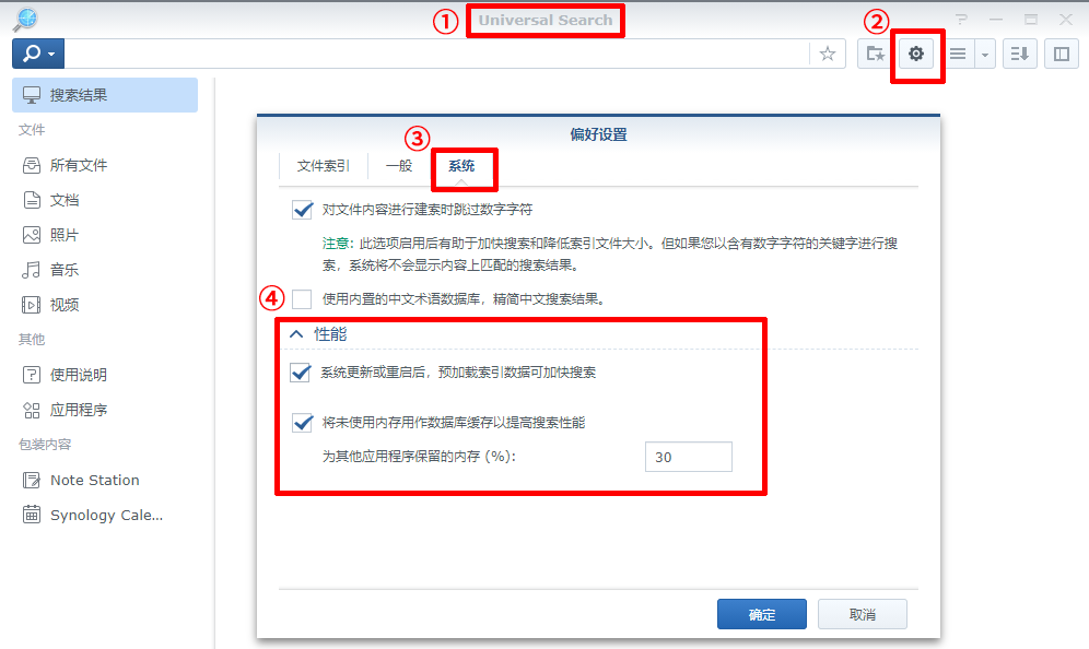 如果NAS内存常年有富余的同学,可以在【Universal Search】>【偏好设置】>【系统】>【性能】中,根据自己的需要开启两个选项,之后 DSM 会将索引表缓存入内存中,加快搜索过程的速度。ps:是搜索速度,不是索引的速度哦
