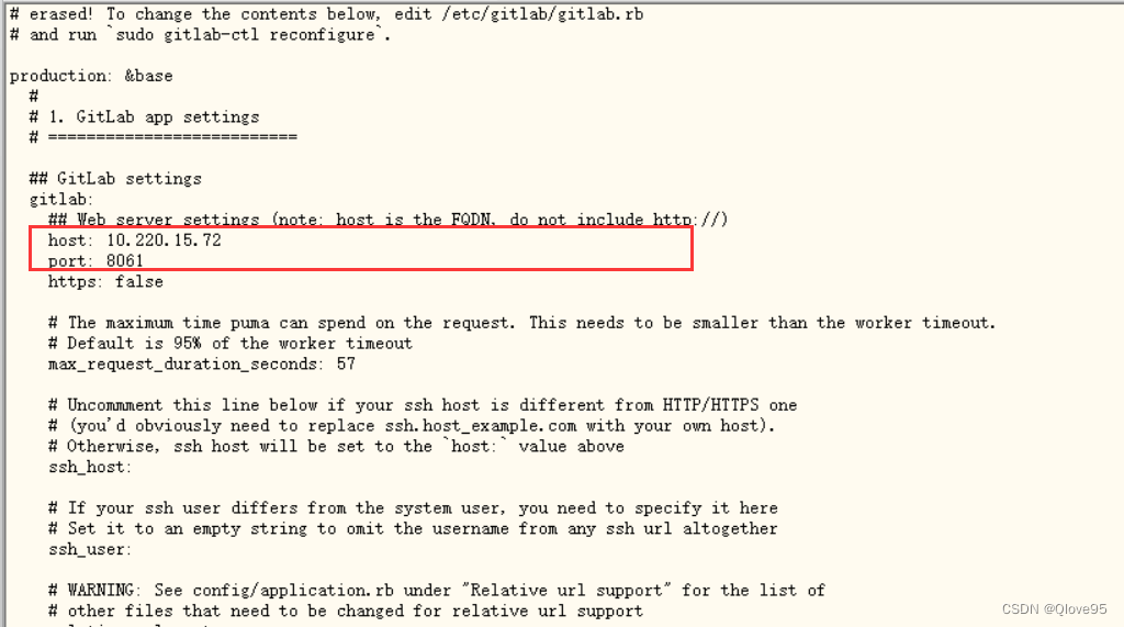 需修改的内容同linux直接安装一样,调整为docker映射过后的宿主机的对应配置(需注意docker容器需要映射宿主机端口,这里external_url ‘http://ip地址’,不需要额外填写端口号)