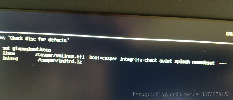 在linux那行最末尾处删掉三个横杠,替换为nomodeset