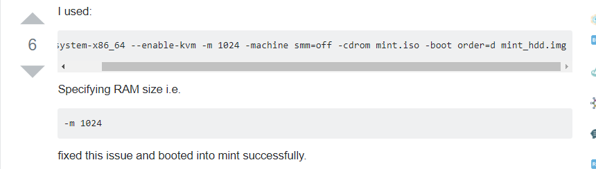 qemu-system-x86_64 --enable-kvm -m 1024 -machine smm=off -cdrom mint.iso -boot order=d mint_hdd.img
