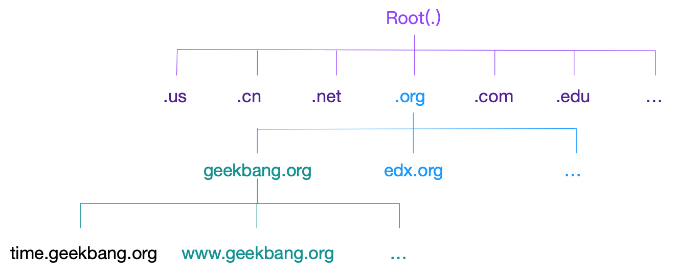 我们以极客时间的网站 time.geekbang.org 为例,来理解域名的含义。这个字符串中,最后面的 org 是顶级域名,中间的 geekbang 是二级域名,而最左边的 time 则是三级域名。