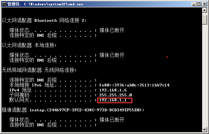 默认网关. . . . . . . . . . . . . : 192.168.1.1