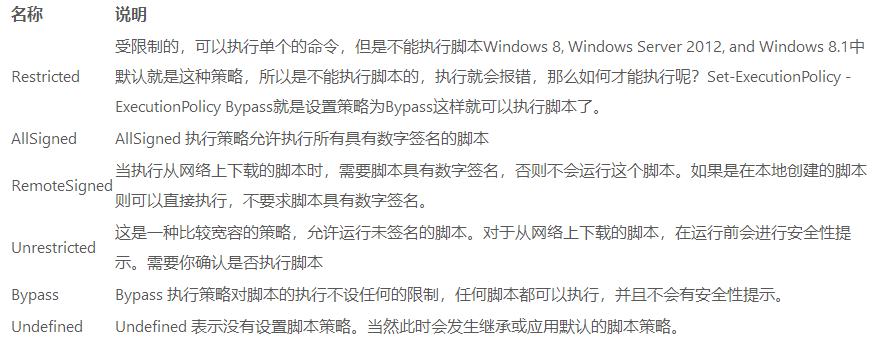 那么你可能会在调用脚本的时候出现报错,这是 powershell 的安全执行策略,下面我们来了解一下执行策略:PowerShell 提供了 Restricted、AllSigned、RemoteSigned、Unrestricted、Bypass、Undefined 六种类型的执行策略简单介绍各种策略如下: