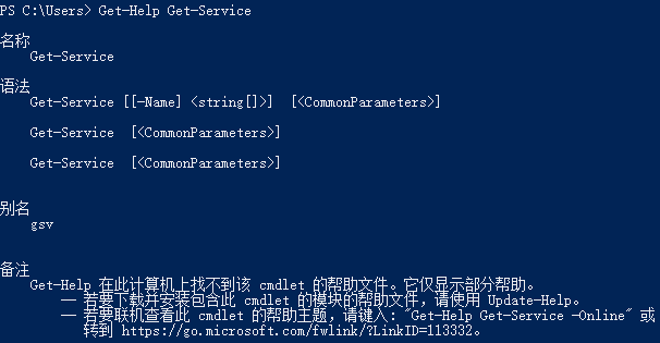 显示有关get-service cmdlet的帮助